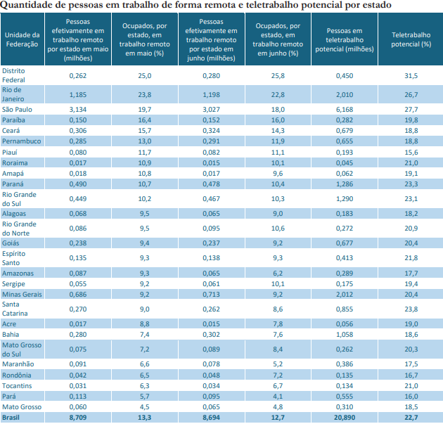 - Perfil do Teletrabalhador: A maioria das pessoas atuando remotamente no país são mulheres, com idade entre 30 e 39 anos, de cor branca e com ensino superior completo.